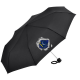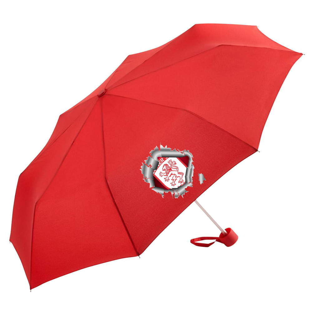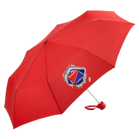 Auf schlechte Witterung immer gut vorbereitet: Mit dem praktischen Taschenschirm im trendigen Look. Mit seinem praktischen Griff lässt er sich gut und sicher halten. Der Schirm ist leicht aufzuspannen und lässt sich genauso unkompliziert zusammenklappen. Geöffnet besitzt er eine schöne Größe und zeigt den Vereinsprint. Die Gestellkonstruktion zeigt sich robust. In geschlossenem Zustand wird er fixiert und passt in jede Tasche. Hübsch und zweckmäßig: der praktische öffnet & schließt per Knopfdruck (am Griff). Ein absolutes Must-Have.